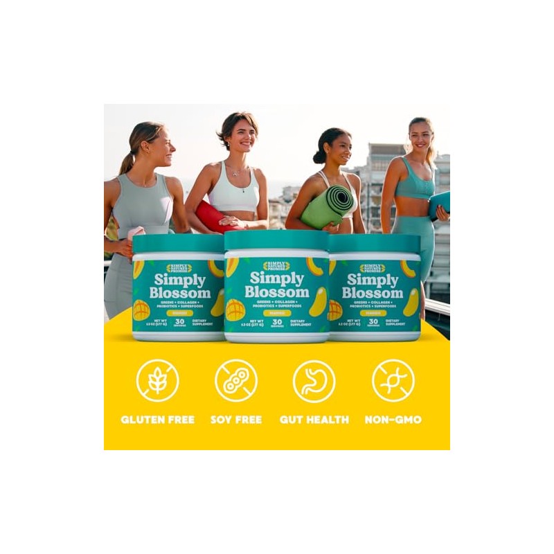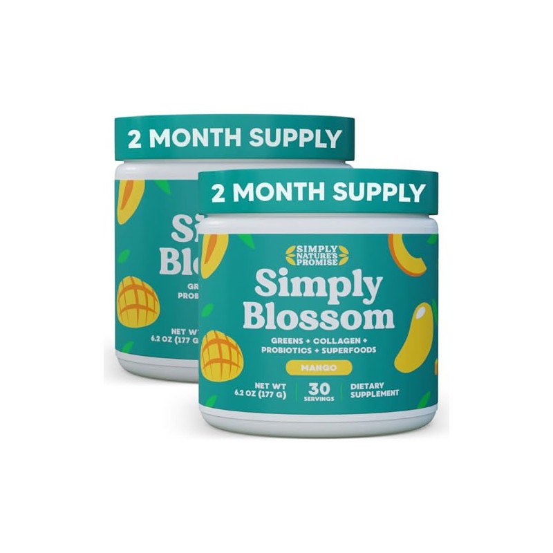 Simply Nature's Promise Simply Blossom Nutrition Daily Greens & Superfood Powder + Collagen + Probiotics for Women's Digestive Health & Bloating Relief. Help Your Health Bloom - 2 Month Supply - Mango