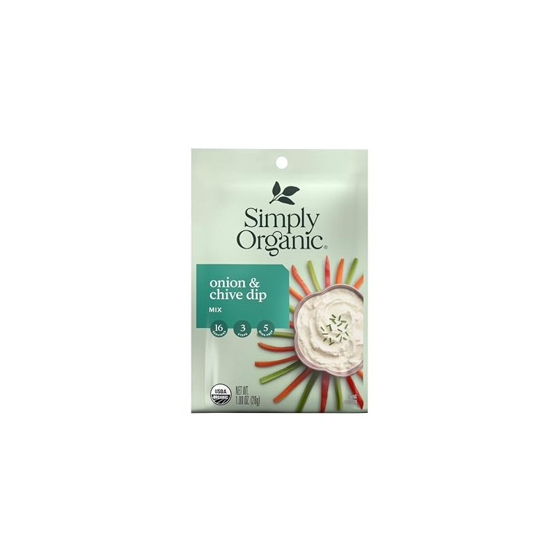Simply Organic Mix Dip Onion and Chive. No Artificial Flavors, Preservatives. The product temperature is Ambient Room Temperature.