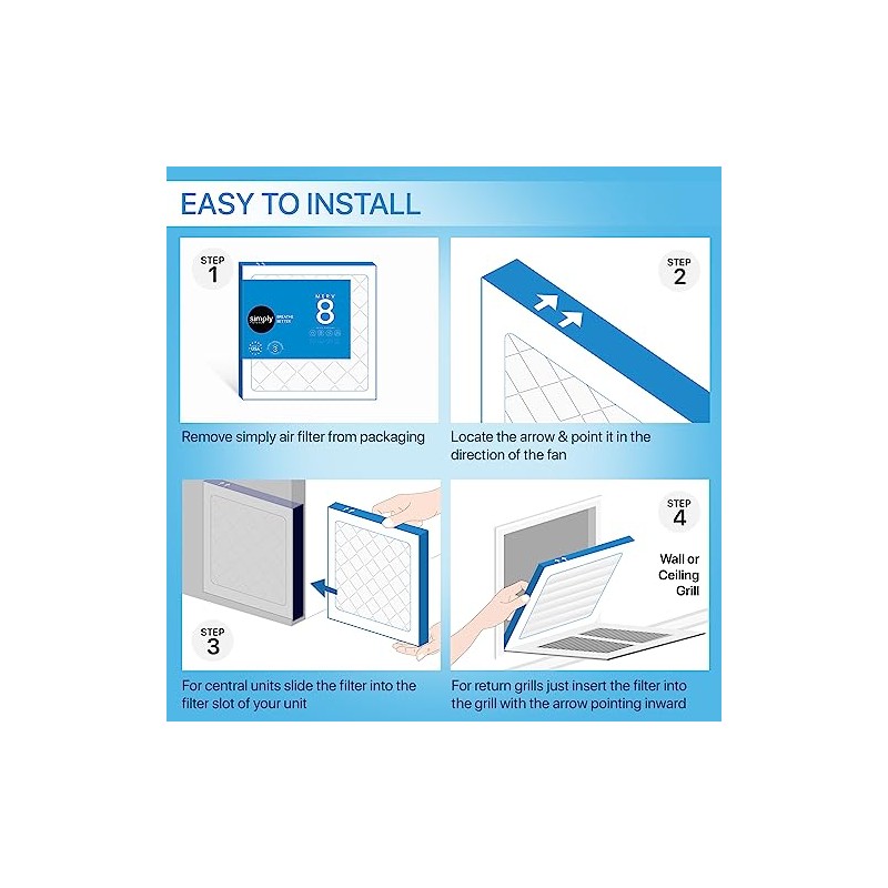Introducing Simply Filters 20"x23"x1" MERV 8 Air Filter, your go-to solution for a healthier indoor environment. This six Pack of filters, with an actual size of 19.75"x22.75" x 0.75" is universally compatible, fitting seamlessly into both residential and commercial HVAC systems, working effortlessly with almost any brand. Comparable to renowned brands like 3M Filtrete MPR 600, Filterbuy AFB Silver, and Honey well FPR 5, our filters are designed to create a cleaner environment by capturing airborne particles like dust, pet dander, lint, and pollen, ensuring fresh and clean indoor air.Experience advanced pleated technology with a higher pleat count than most retail filters, enhancing airflow and efficiency. Crafted in the USA with meticulous attention to detail, our filters are ideal for any residential setting, providing long-lasting performance for up to 3 months. Easy to install or replace, whether in air condition units, furnaces, heat pumps, or HVAC systems, simply slide the filter into the slot or follow the airflow arrows for return grills, and you're done!Your order is delivered germ and dust-free, thanks to our heat-sealed shrink wrap packaging. Consider significant savings with our subscription program for convenient auto-deliveries. Plus, experience the excellence of American craftsmanship - every filter is proudly made in the USA using 100% American components, ensuring superior filtration.Trust Simply Filters to exceed your expectations, delivering clean, fresh air for a healthier living and working space.