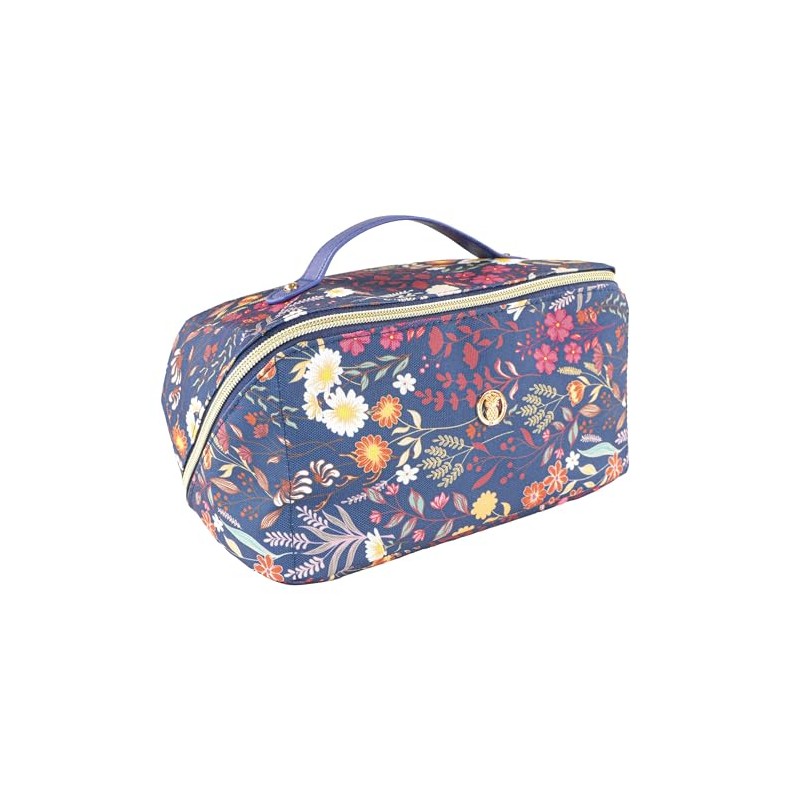 - Navy Field Floral Cosmetic Bag By Simply Southern features a navy with a field of flowers zippered bag, navy carrying handle, lined, 3 inside pockets, zipperd inside pocket, and a metal Pineapple logo. Measures 9.5" x 4" x 5". 90% Polyester 10% PVC.