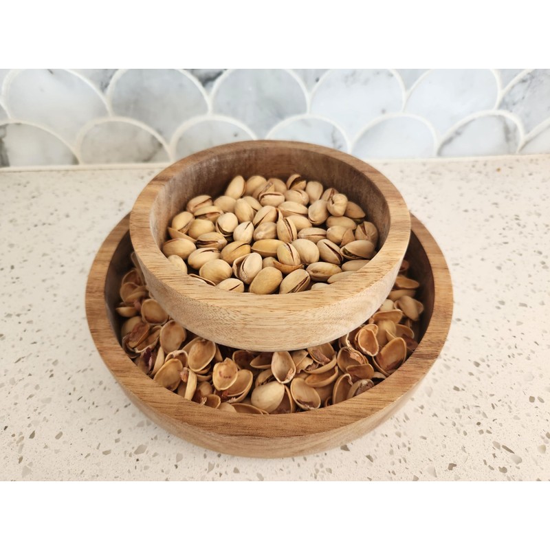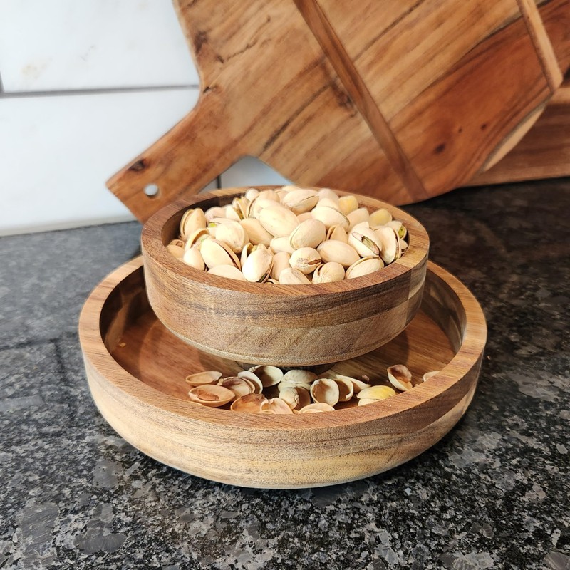 - Perfectly Sized and Round: 5” x 1.5” upper bowl fits one, 8-ounce bag of pistachios. 8” x 1.5” lower bowl holds two bags of shells! Stacked as a pistachio pedestal.
