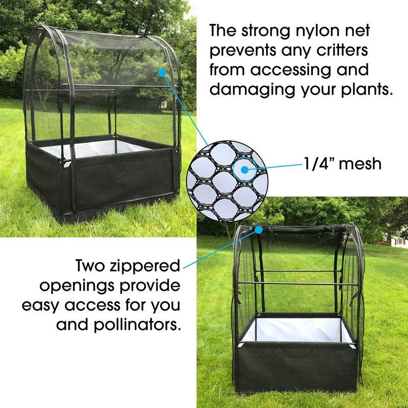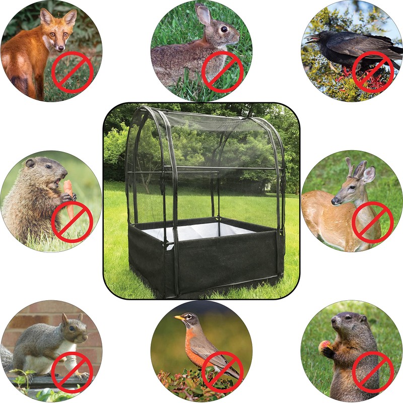 - COMPLETE 3-in-1 SYSTEM: Raised bed + Greenhouse + Protective net. Easy gardening, long grow season, protected from pesky animals like deer, squirrels, gophers, ants, birds, and other critters. You enjoy all the benefits gardening has to offer and have little to worry about. During your plants’ flowering period, you can easily roll up the zippered openings of the protective net during the day to allow hardworking pollinators to do their magic.