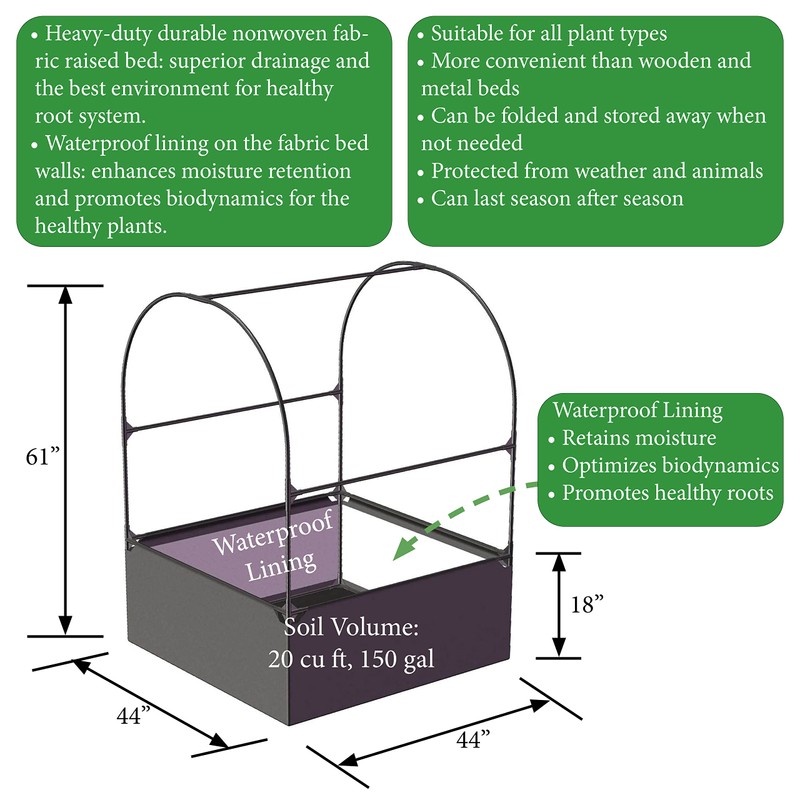 - STRONGER ROOTS, HEALTHIER PLANTS, BIGGER HARVEST: The raised bed is made of premium breathable nonwoven polyethylene fabric that creates superb drainage and allows for optimal air root pruning. The built-in waterproof bed liner is designed for living soil, optimal biodynamics, and organic gardening. The fabric bed is BPA-free and safe for food production. Fabric beds perform better than wood or metal beds in aeration and air pruning that are essential for plant health.