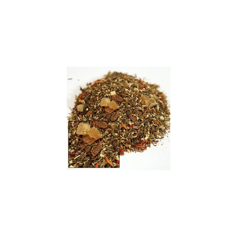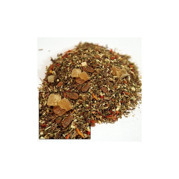 - Organic green rooibos, papaya pieces (papayas and sugar), organic cinnamon chips, flavoring and safflowers