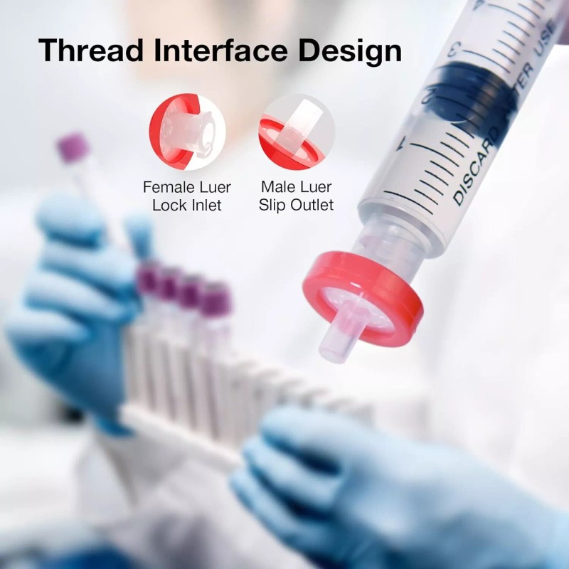 PTFE syringe filters housing is made of premium polypropylene(PP) material with a unique threaded interface (Luer lock) design, non-sterile, no adhesive, and no contamination of the sample. It can be autoclaved and sterilized at 121°C/249.8℉ for 30 minutes.