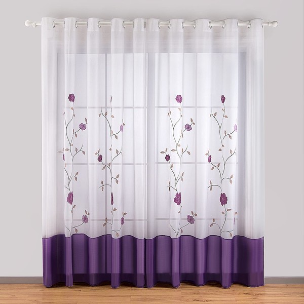 SIMPVALE Sheer Voile Floral Embroidery Curtains with Eyelets Transparent Curtain Living Room Bedroom Purple 140 x 245 cm (W x H) Pack of 2