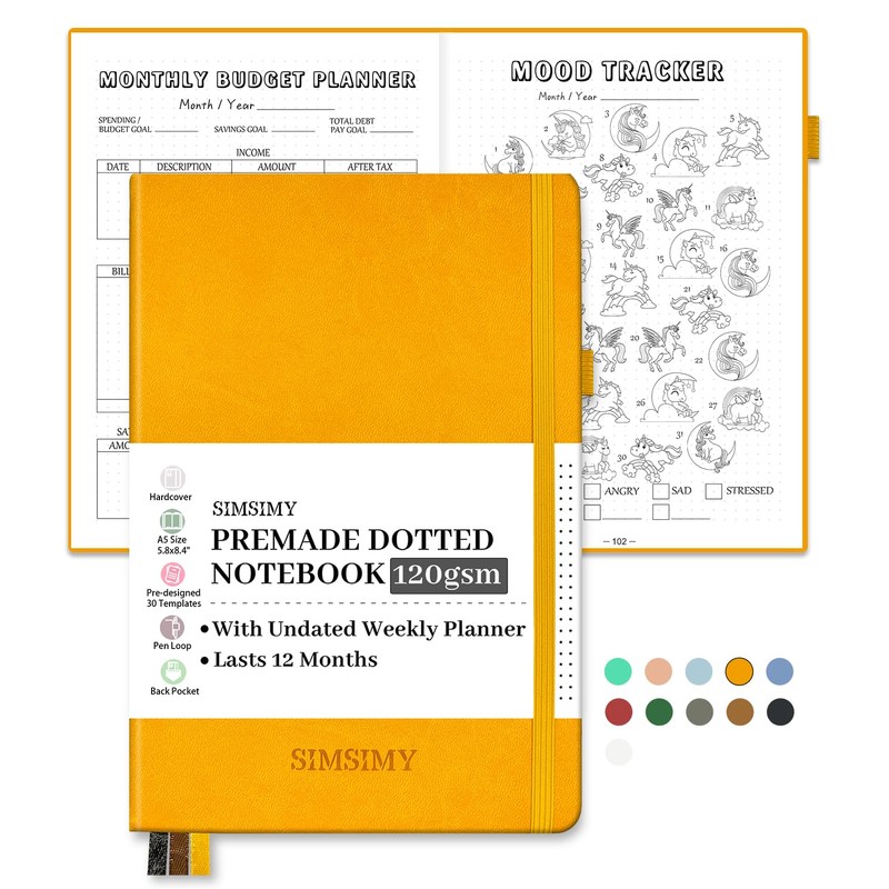 SIMSIMY Premade Bullet Dotted Journal Notebook, Pre-made Dot Grid Journaling with Undated Weekly & Monthly Planner, Various Trackers, Lasts 1 Year, A5