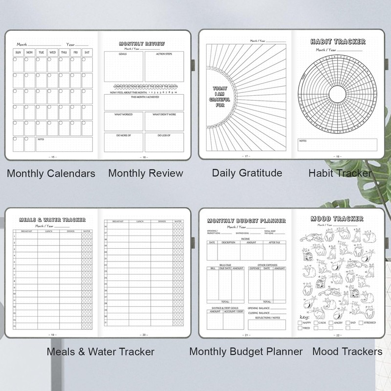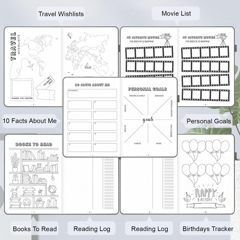 - FUNCTIONALITY & CONVENIENCE - Our dot journal with basic premade pages, plus blank pages to make your own. Sections include: Index, Weekly Planner, Monthly Calendar, Monthly Review, Daily Gratitude, Monthly Budget Planner, Savings Jar, Habit Tracker, Mood Tracker [12 different sets], Meals & Water Tracker, Sleep Tracker, Year of Exercise, Year in Pixels, 10 Facts About Me, Personal Goals, Travel Wishlists, Movies Lists, Bookshelf, Reading Log, Birthday Tracker, and blank dotted page (21 pages).