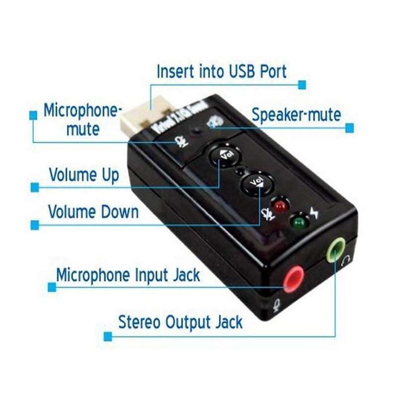 Technical Specification 100% New 7.1 Channel External USB Audio Sound Card Adapter USB2.0 Full-Speed Specification Connectors: USB Type A, Stereo output jack, mono microphone input jack USB bus-powered, no external power required LED indicators: Microphone-Mute Status.