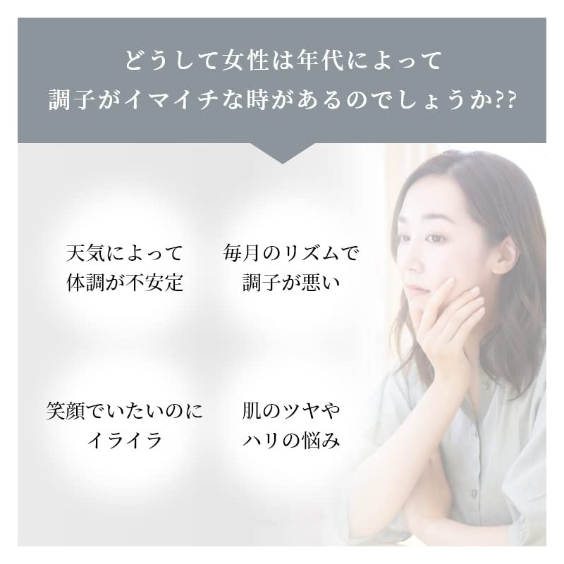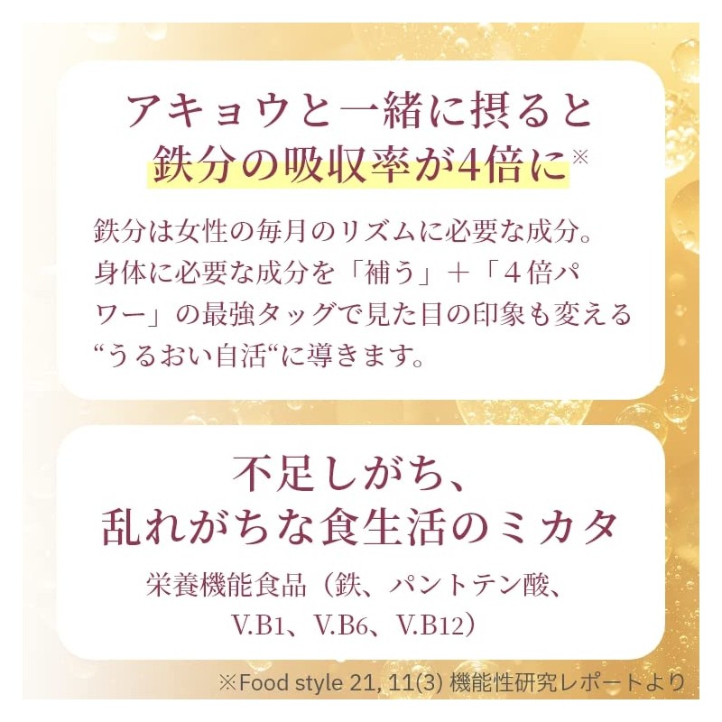 - 1日あたりアキョウ1,116mg・プラセンタ360mg。さらに鉄分・ビタミンB1・B2・B6・B12・葉酸など、女性に欠かせない成分を配合!