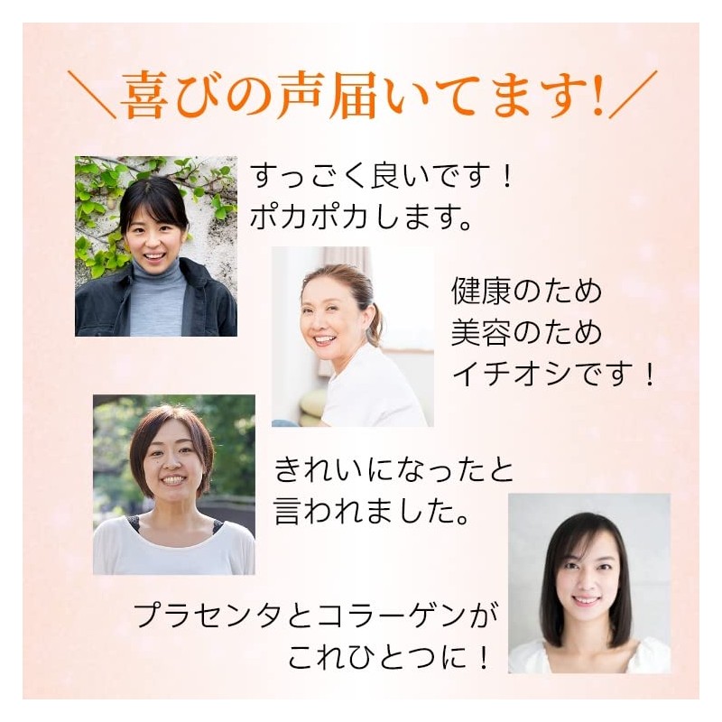- 原材料名:アキョウ、豚プラセンタエキス、還元麦芽糖、セルロース、フェルラ酸、二酸化ケイ素、ステアリン酸Ca、ピロリン酸鉄、V.C、環状オリゴ糖、ナイアシン、パントテン酸Ca、乳酸Ca、V.B1、V.B6、V.B2、葉酸、V.B1
