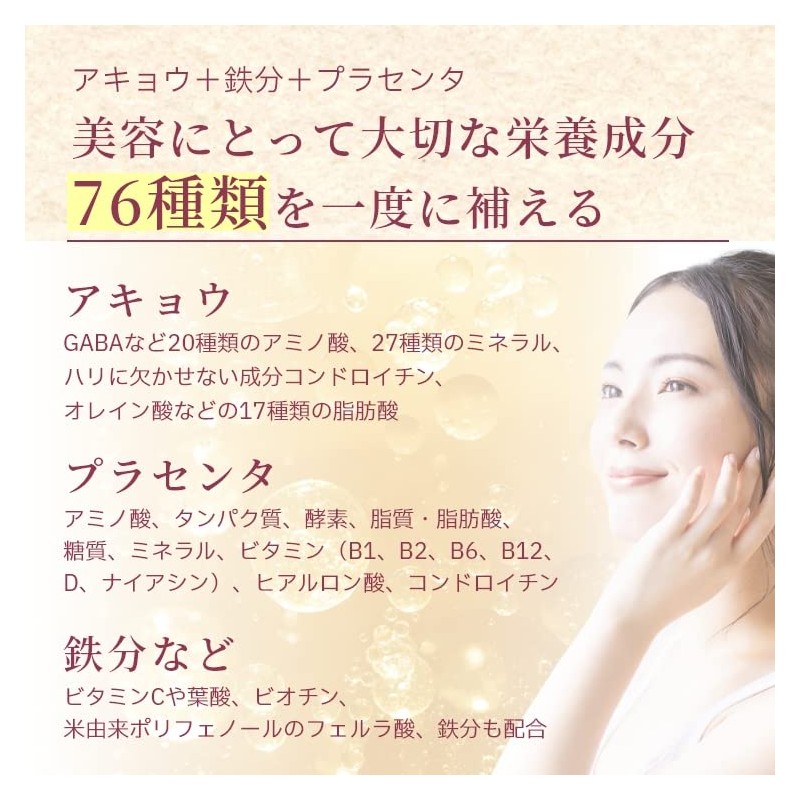 宮廷女性の美容素材として愛されてきたアキョウに加え、大人気の美容成分プラセンタを独自処方。