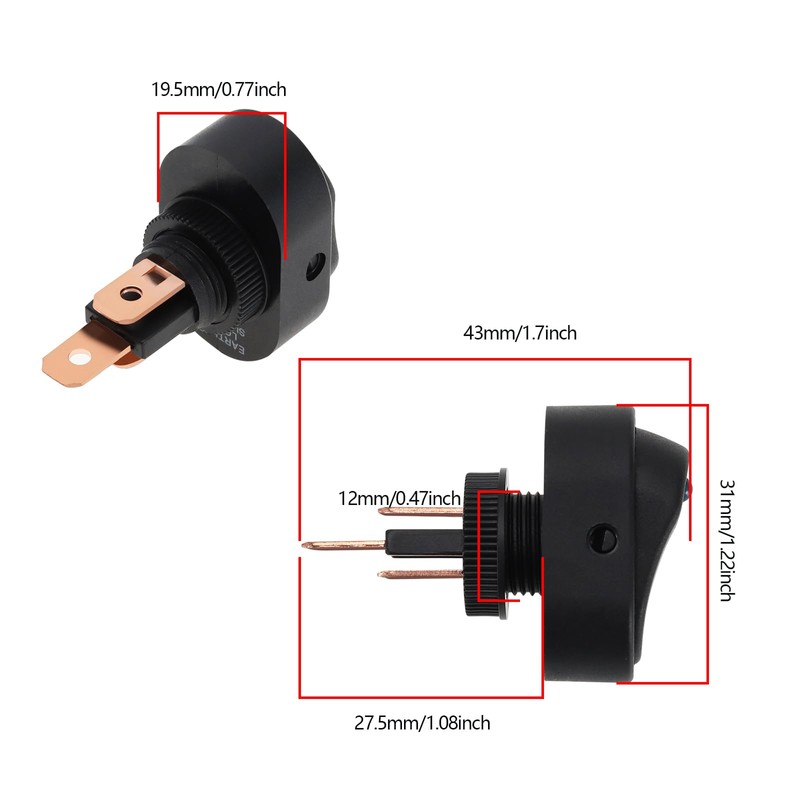 - The size of rocker switch is 31x19.5x43mm, Mounting hole diameter is 12mm, just drill a hold the right size and it slides straight in.