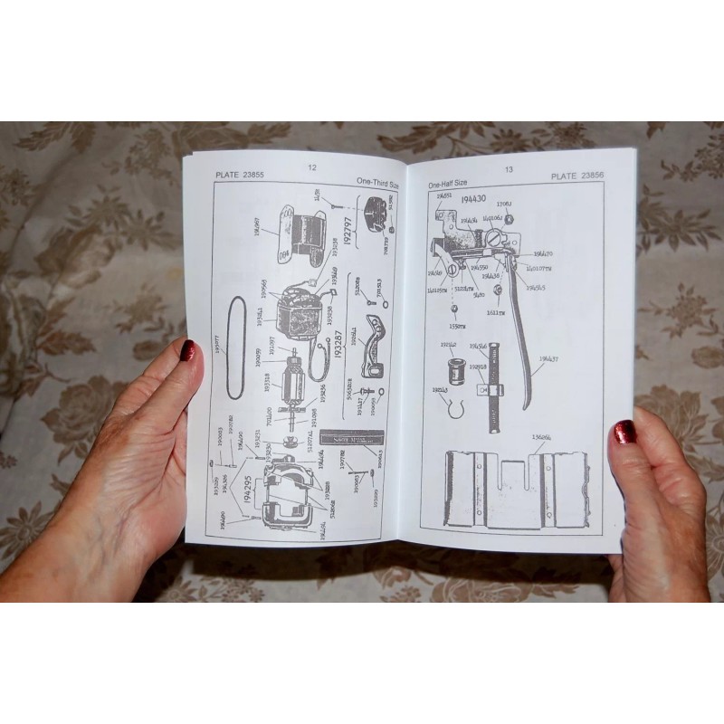 Every single component, screw, nut, spring, plate, rod, hinge, handle, arm, etc. are shown. Every internal part of the motor is shown. All the components and parts of every single accessory are shown. All these parts and components are illustrated in the proper size with respect to their actual size and with respect to each other.