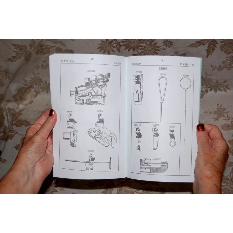 This 32-page manual is complete and very clean with no "black dots," smudges, stains, or any other imperfections. No pages are missing, dirty, or damaged. The manual includes illustrations of every single part of the machine, motor parts, speed control pedal, light fixture, accessories, and much more.