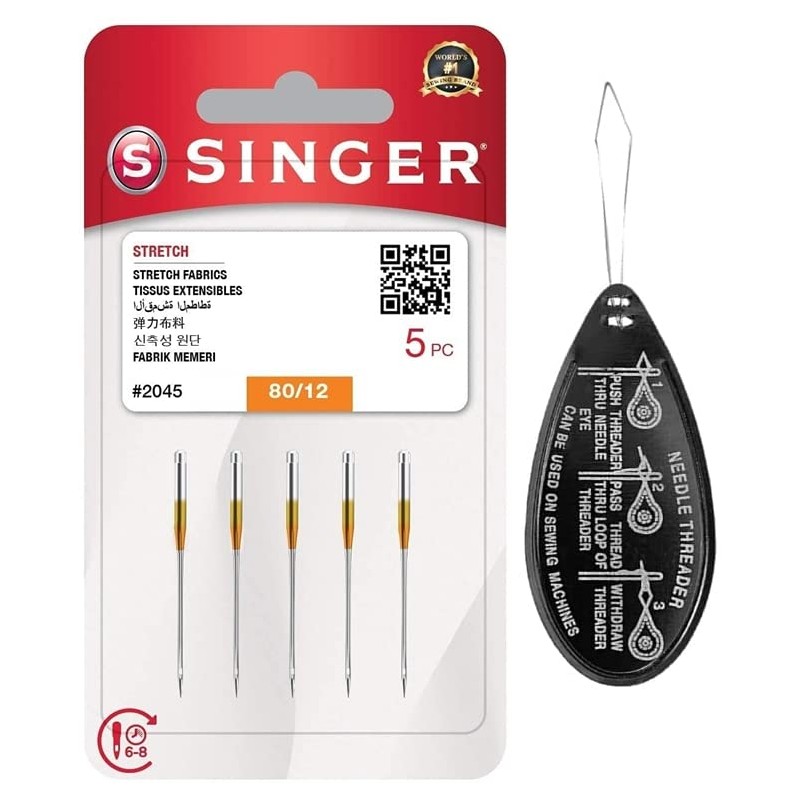 Singer Stretch Ball Point 2045 Sewing Machine Needles, Packet of 5, Size 80/12, Includes Large Needle Threader