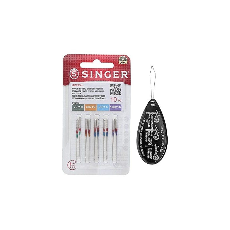Singer Universal 2020 Sewing Machine Needles, Packet of 10, Assorted Sizes 70/10, 80/12, 90/14 & 100/16, Includes Large Needle Threader