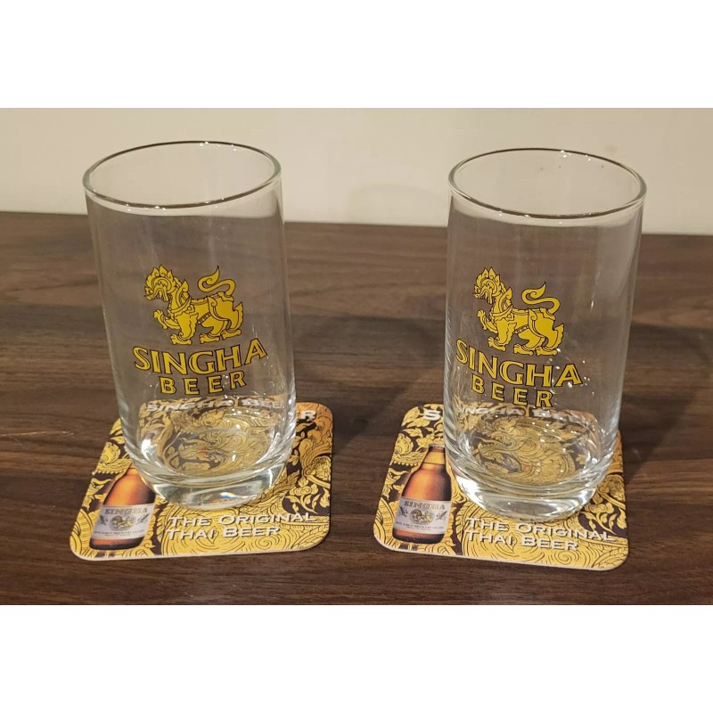 Set of 2 Thailand Singha Beer glasses with cardboard coasters, brand new condition.