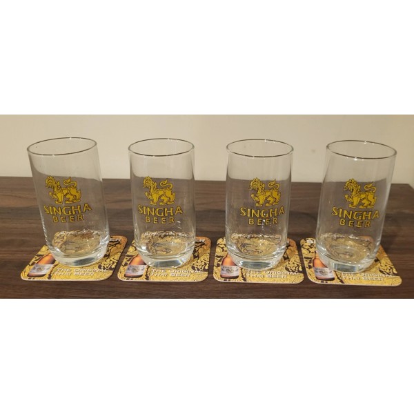 Set of 4 Thailand Singha Beer glasses with cardboard coasters, brand new condition.