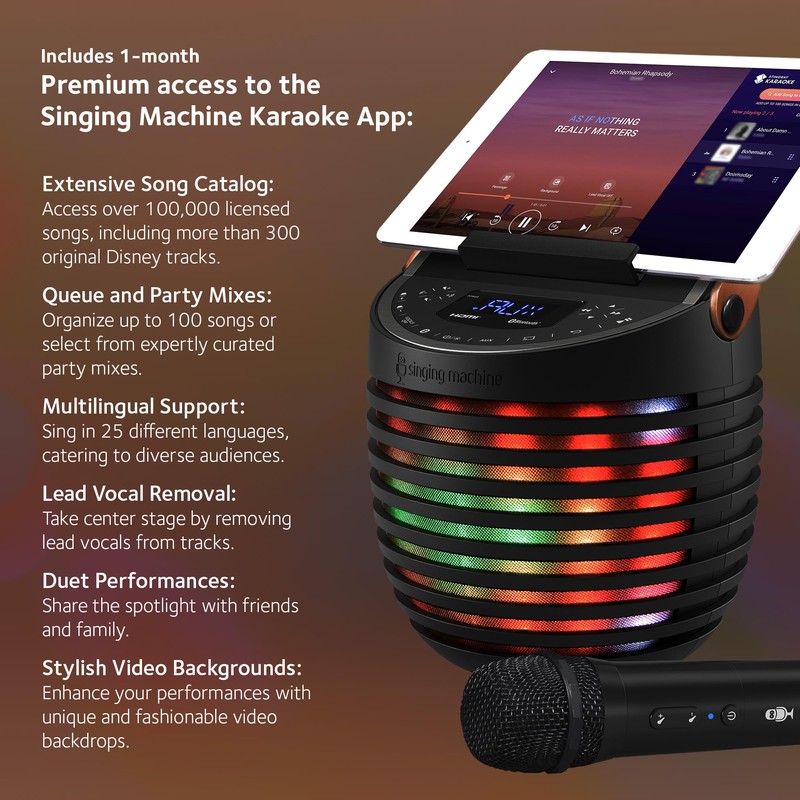 - Lyrics On the Big Screen: Project content from the SMC Karaoke App onto your TV using the system's casting capability. Gain 1 month of premium access to a vast library of karaoke music for endless entertainment, with family-friendly lyrics so everyone can have fun when you download our app: Singing Machine Karaoke!