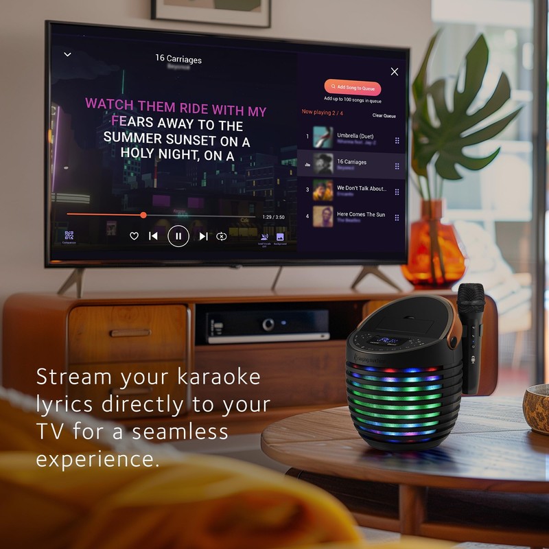- Endless Fun: Create a dynamic atmosphere with LED lights that pulse to the beat. Enjoy features like echo voice effects, lead vocal removal technology, and powerful sound output. A rotatable microphone holder and anti-slip device cradle ensure easy use.