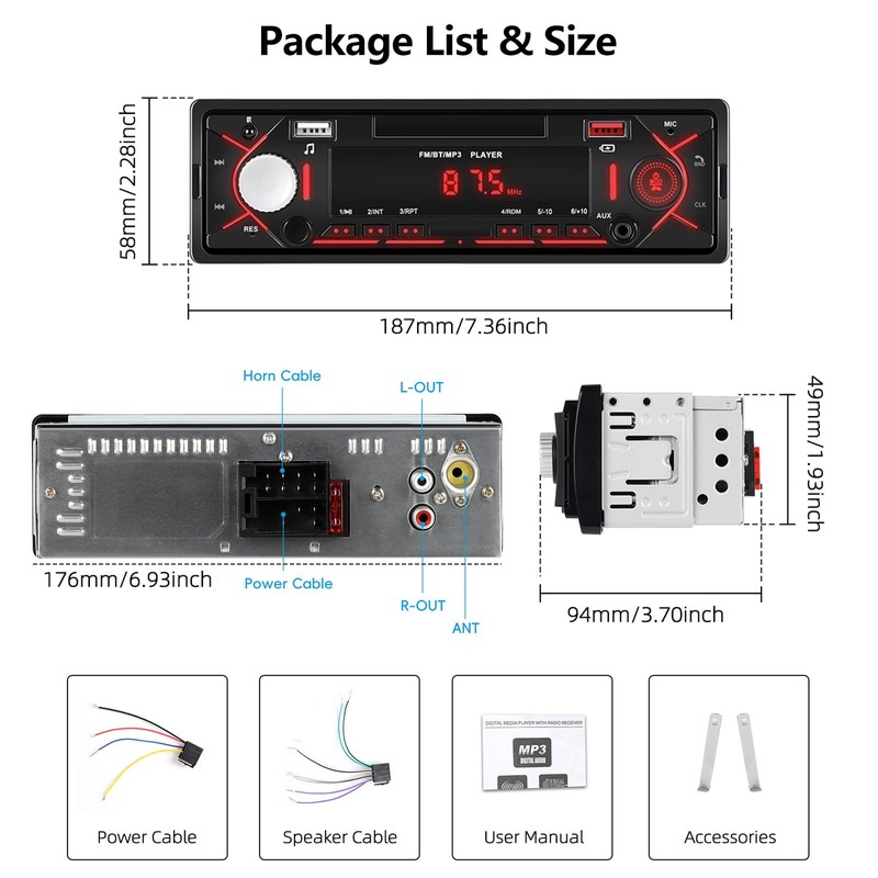 - 【USB/SD/AUX-IN and excellent sound quality】This MP3 car player is equipped with front USB port/SD card slot/aux-in jack, allowing you to enjoy multi-source music freely. The car Bluetooth radio supports amplifiers and can connect up to four speakers. You can connect your subwoofer via the RCA audio out port