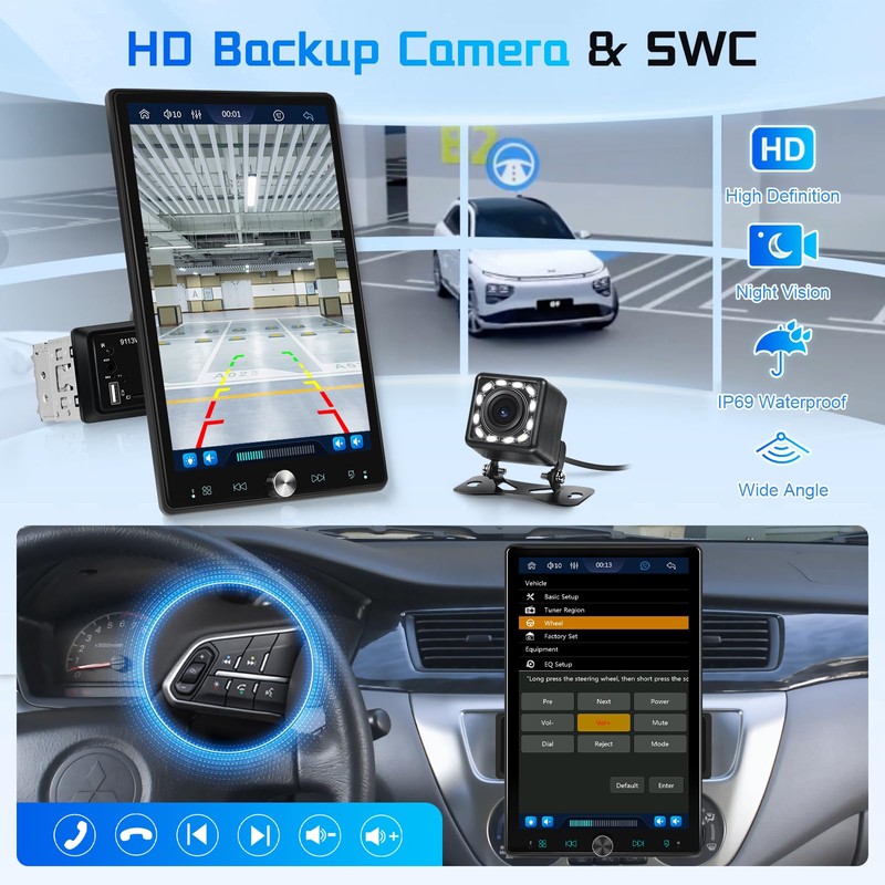 - HD Backup Camera / SWC: Equipped with a wide-angle, waterproof, HD, and night vision camera, Makes reversing easier and more convenient.This single din car stereo also supports original steering wheel controls for volume and song switching