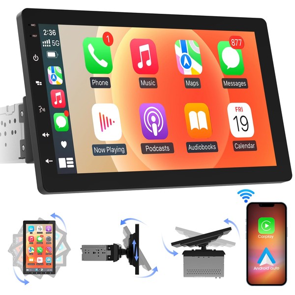 - Adjustable Floating Screen: This sleek design single din carplay headunit boasts a 360° rotatable and adjustable display that immerse yourself in a world of audio and visual excellence with optimal viewing angles, making your vehicle's dashboard to life like never before