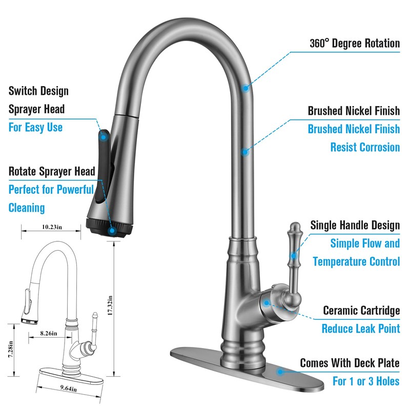 • Excellent Customer Service: If you have any questions or concerns about stainless steel kitchen faucet, we strive to ensure your satisfaction with our product, offering a hassle-free warranty and prompt resolution of any issues. Choose our faucet and experience the difference of exceptional customer service.
