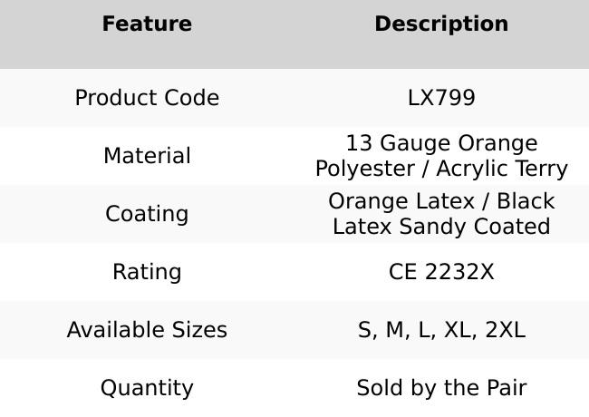 Note: The table highlights the key features of the LX799 gloves, including the 13 gauge orange polyester/acrylic terry shell, coated with orange and black latex sandy finish for excellent grip and abrasion resistance. The gloves have a CE 2232X rating, indicating their safety standards. They are available in sizes S, M, L, and XL, and are sold by the pair. These gloves are ideal for providing the protection needed for tough jobs.