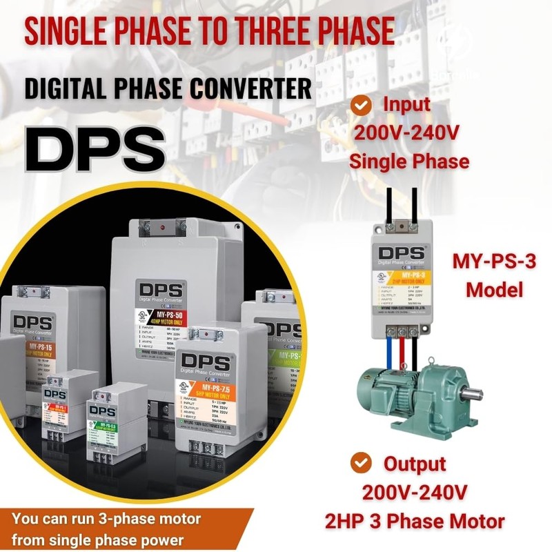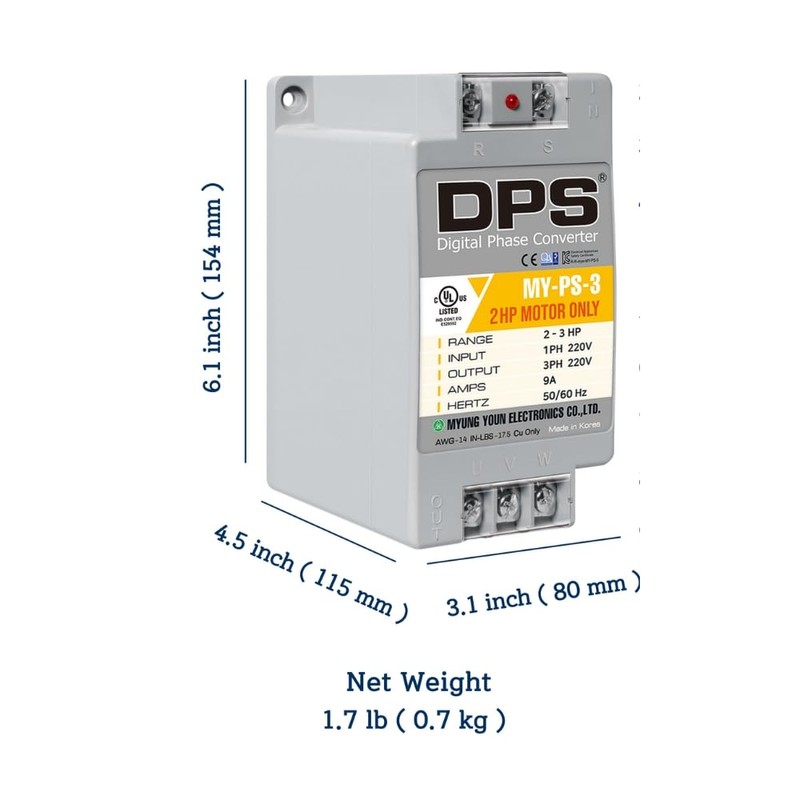 DPS is a device that supplies 3-phase 200V-240V to a 3-phase motor with a single-phase 200V-240V input. It is the first phase converter to receive UL certification, thereby enhancing safety, and is increasing customer satisfaction through strict quality control and customer management. MY-PS-3 model should be used for a 200V-240V 2HP(1.5kW) 6amps 3 phase motor. Check the motor’s rated current(A), horsepower(HP), and voltage(V). DPS is a product that runs a 200V-240V 3 phase motor from single phase 200V-240V. The DPS is equipped with safety covers on the input and output for customer safety. One DPS must be used for only one motor. One DPS should never be used on multiple motors. If you are unsure about selecting a DPS model, contact the seller or manufacturer. After purchasing, thoroughly read the user manual enclosed with the product and then install the DPS on the motor. Installation method is simple. Simply connect the 2 input wires to the DPS input and the 3 wires of the motor to the DPS output. DPS CAUTIONS 1) The DPS must be properly selected and used according to the motor specifications. Check the motor's rated current(A), horsepower(HP), and voltage(V) to select the DPS model. 2) The MY-PS-3 model should be used for 200V-240V 2HP 6A 3-phase motor. If used on motor with less than 2HP (e.g. 1HP motor, 0.5HP motor), the motor may generateheat, make noise, and cause problems with motor operation. 3) The DPS should only be used on one motor; one DPS should not be used on multiple motors. 4) The DPS can make 200V-240V single-phase to 200V-240V 3-phase. 5) The voltage of the motor must be set to 200V-240V (delta wired). 6) Efficiency is around 90% when using a DPS model that matches the motor specifications. 7) Make sure the wire thickness is suitable for the motor current rating. 8) DPS does not work with 3-phase motor equipped with 3-phase brake. 9) The DPS drives the motor to create an induced 3-phase, so you can measure 3-phase at the DPSoutput when the motor is running. If the motor is not running, you cannot measure 3-phase at theDPS output. 10) If you connect a magnetic contactor between the motor and the DPS, be sure to connect the two control wires coming from the magnetic contactor to the 'U' and 'W' terminals of the DPS output. If the motor does not run when power is applied, try swapping the positions of the three wires connected to the DPS output. If you want to reverse the rotation, simply swap the 'U' and 'W' wires of the three wires connected to the DPS output. 11) For motors with high capacity, electronic overcurrent relays (EOCR) are often installed on magnets and other devices to protect the motor. In this case, the current value setting should be larger than the rated current of the motor, otherwise the motor may not start or the motor may stop during operation. Also, the capacity of the breaker should be larger than the rated current of the motor, otherwise the breaker may trip while the motor is running. 12) If the machine has a magnetic contactor, it must be for 220V only. The DPS cannot work with 380V or 440V magnetic contactor. 13) Generally speaking, phase converter makes 3-phase from a single-phase, which can inherently cause current imbalance. And the current values of 'U' and 'W' phase of the DPS output change according to the load of the motor. Therefore, when the motor is not heavily loaded at the initial startup, there may be an imbalance in the current of the 'U' and 'W' phases of the DPS output. However, when the motor is loaded with more than 80%, the 'U' and 'W' current values are balanced. Also, the 'V' current value is approximately the same or slightly lower than the rated current value of the motor. 14) If you are experiencing current imbalance when the motor is loaded at 80% or more, please check the DPS model settings. The DPS has available models based on the specifications of each motor. If you use a DPS that is higher than the motor specification, the motor may generate heat or noise. Also, make sure that the motor is not overloaded. DPS efficiency is around 90%. Typically, the 3-phase supplied by the power company and the 3-phase produced by the DPS are different. This is because the DPS converts from single-phase to 3-phase. Therefore, we recommend using a motor efficiency of 90% or less.