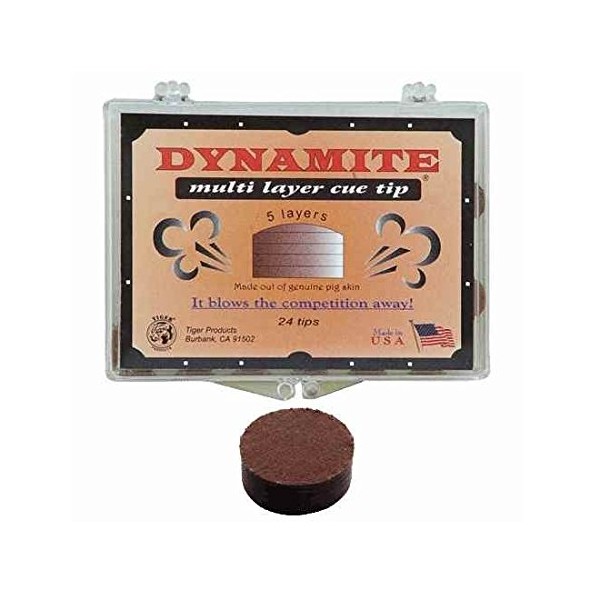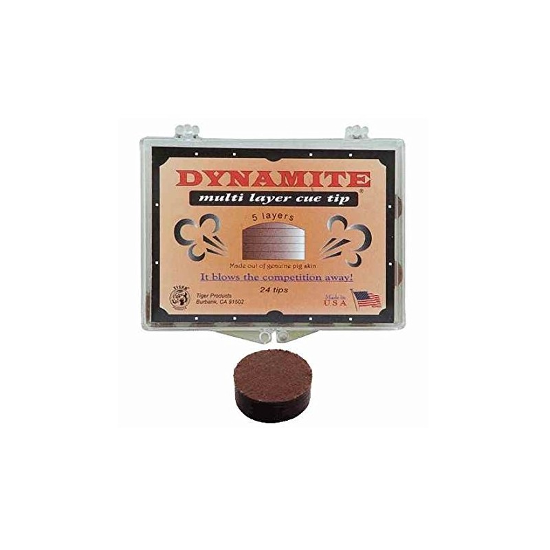 This Medium hard cue tip is a very consistent cue tip with a lot of control. Dynamite multi layer cue tip is made out of five layers of pig leather and treated to a specific hardness naturally. Laminated with VACULAM? process Dynamite cue tip is the best priced laminated cue tip for its quality and durability. When you play with Dynamite multi layer cue tip, it blows the competition away. PLEASE NOTE: The price posted for this item is for a single tip, not the entire carton.