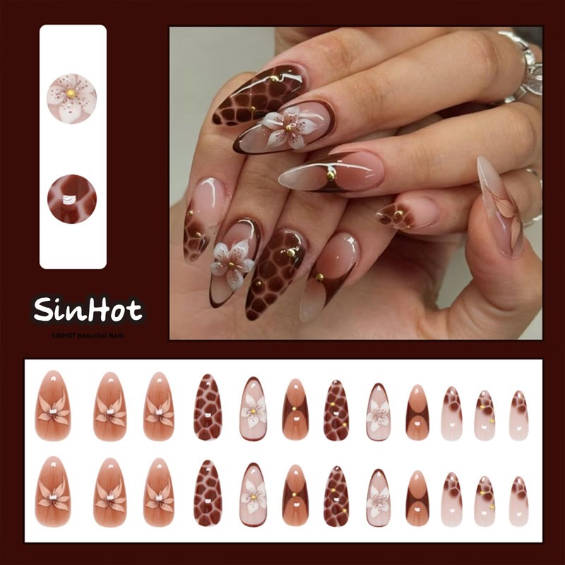 SINHOT Almond Press on Nails - Medium Fake Nails, Glossy Finish, 3D Flower & Leopard Print, DIY Artificial False Nail Art - 24 Pcs Nail Kit with Glue