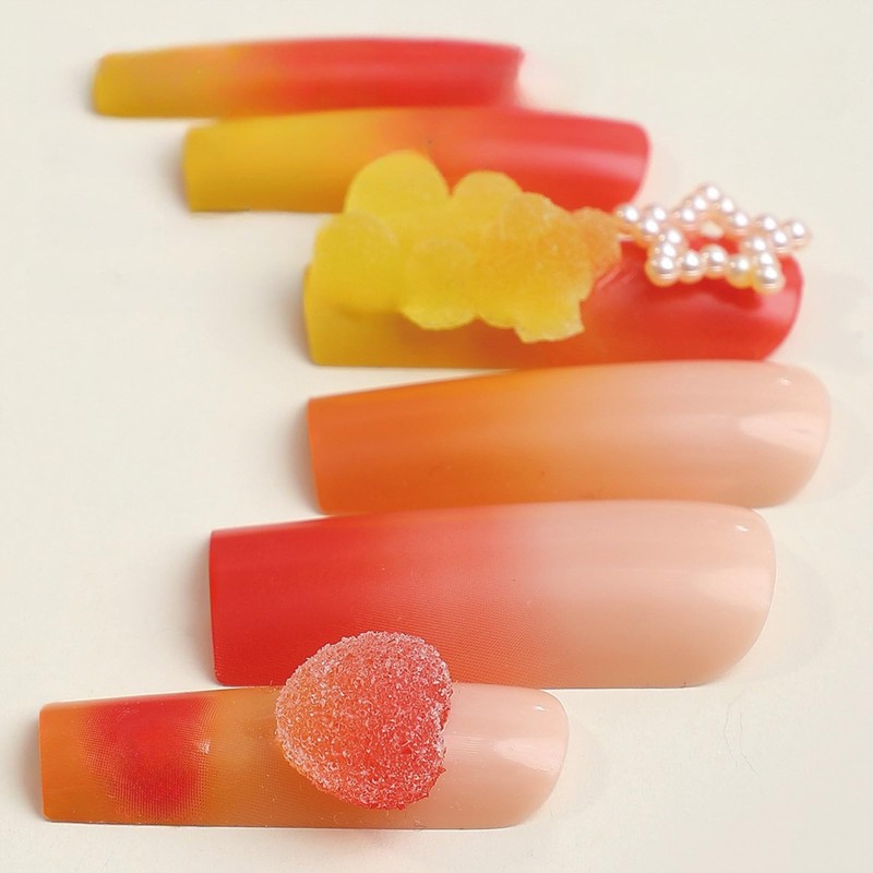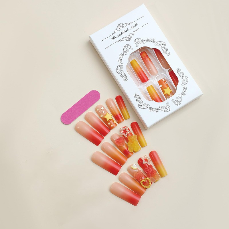 SINHOT Long Press on Nails Square Fake Nails Glossy Glue on Nails Yellow Orange Ombre Acrylic Nails Squoval Artificial Nails 3D Bear Stick on False Nails with Design 24 pcs