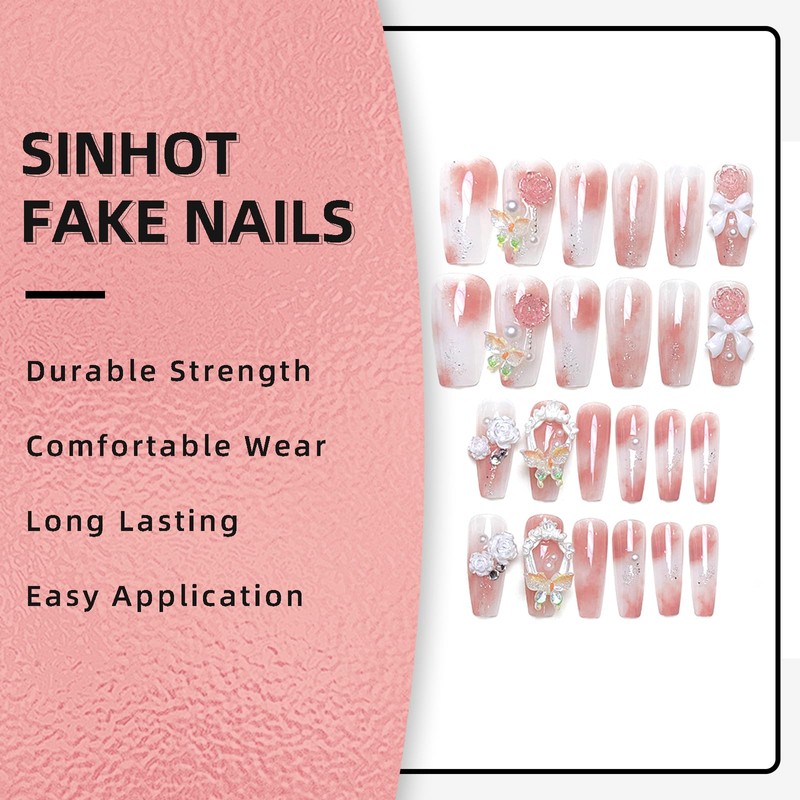SINHOT Luxury Press on Nails - Long Coffin Fake Nails 3D Handmade Elegant Flowers Reusable False Nails with Rhinestone Designs,DIY Artificial Nail Art, 24pcs