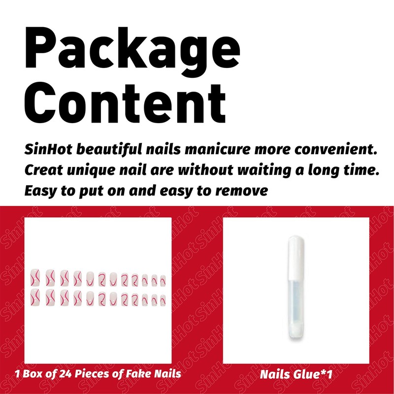 SINHOT Medium Square Press on Nails Squoval French Tip Fake Nails Glossy Glue on Nails Acrylic Nails Red Line False Nails with Designs 24 pcs