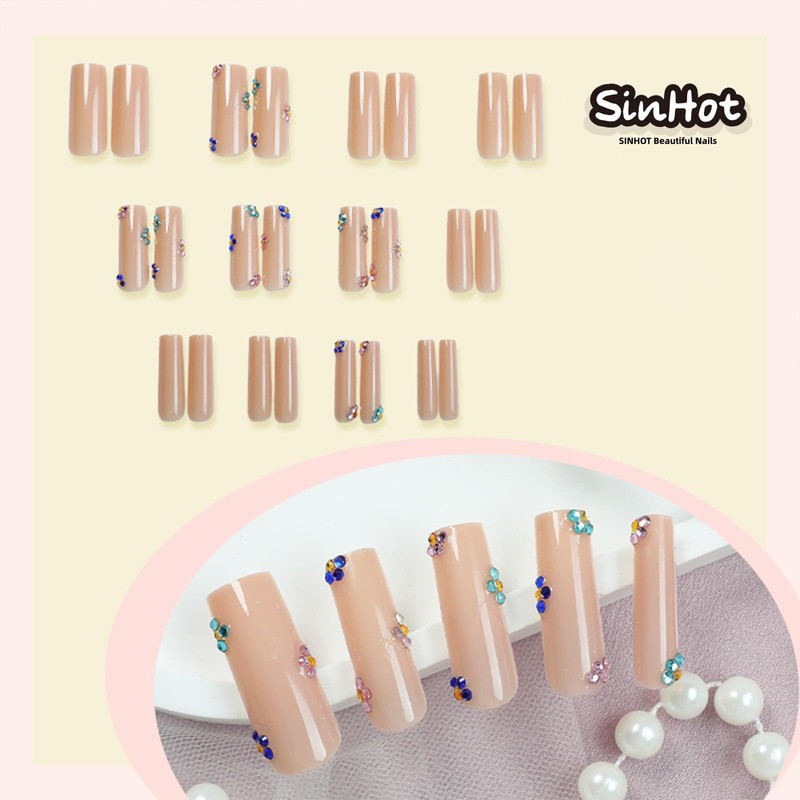 SINHOT Square Press on Nails Long - Colorful Rhinestones Flowers Fake Nails Glossy Glue on Nails Nude Natural Acrylic Nails Squoval Artificial Nails Stick on False Nails with Design 24pcs