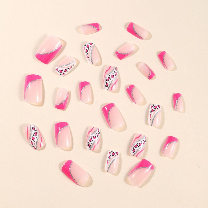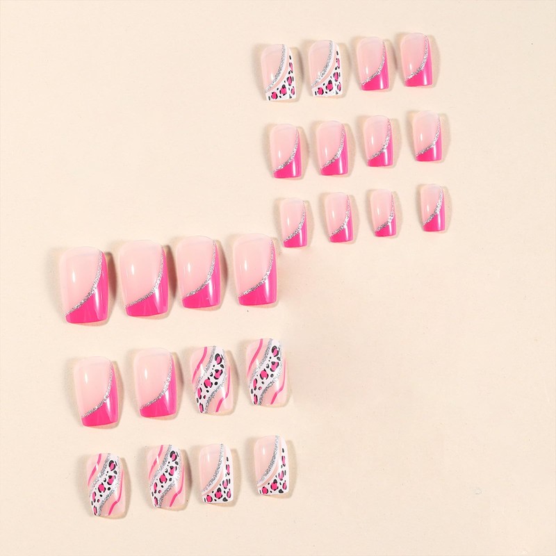 SINHOT Square Press on Nails Short Fake Nails Glossy Glue on Nails Leopard Print Acrylic Nails White Silver Stripes Squoval Artificial Nails Pink French Tip False Nails with Design 24 pcs