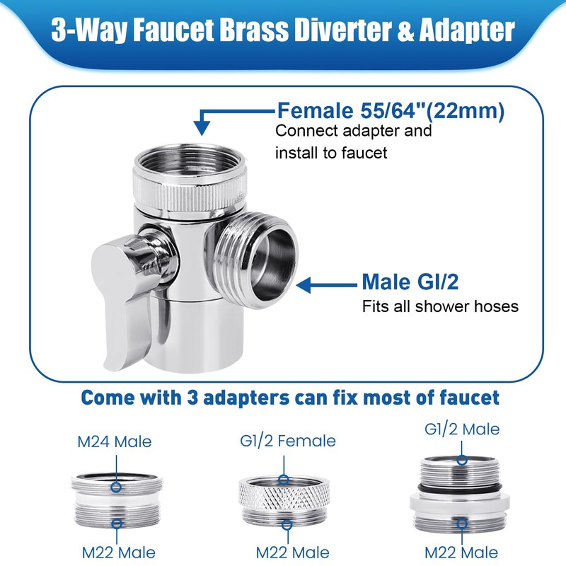 - 【Brass Faucet Valve】3 Way Solid brass faucet diverter with 1 water inlet and 2 outlets, redirects water from faucet spout to the sprayer. It can control water ON/OFF and connect G1/2 regular shower hose/supply hose easily.You can use the water tape avoid water leakage if needed(water tape included in package).