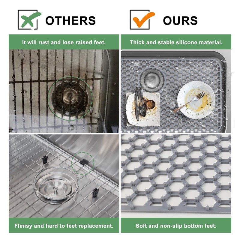 - [Multifunctional Sink Mat] - In addition to being used as a sink protector mat, it can also be used as a farmhouse sink protector mat, kitchen sink silicone draining mat, heat insulating mat, pot mat, storage mat, dish drying compartment, vegetable and melon draining mat, defrosting net, etc., realizing multi-functionality, adding such a beautiful thing to your kitchen will bring you a satisfying surprise.