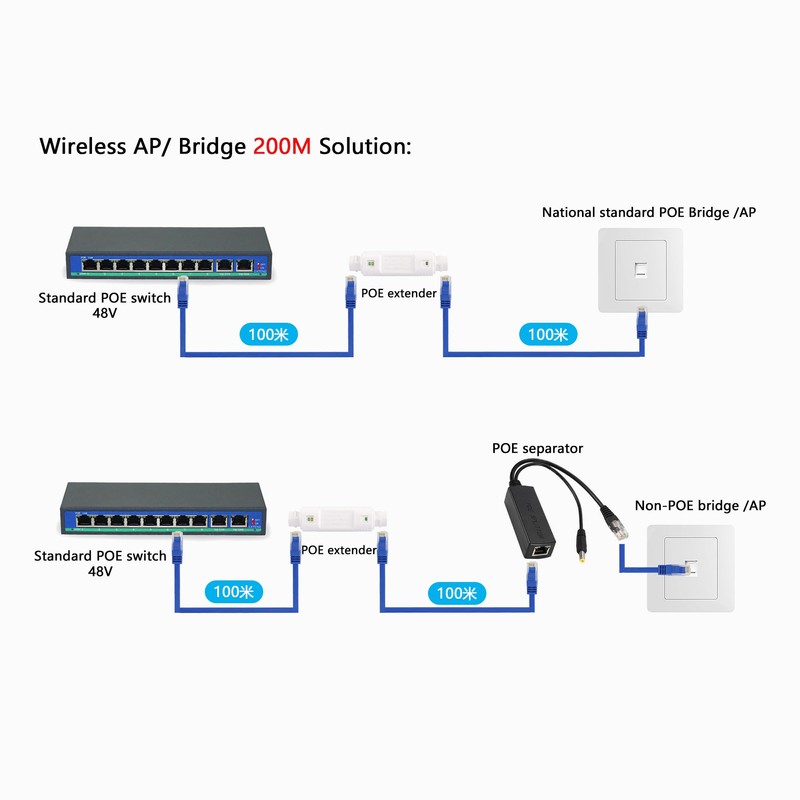 - 【AI 250M Extension】Waterproof PoE extender automatically recognizes the transmission rate, automatically expands to 100 meters or 250 meters depending on the end device, and is easy to extend to wireless access points, base stations, network cameras and other high-power devices via external network data lines. (Please refer to the picture for the use scheme)