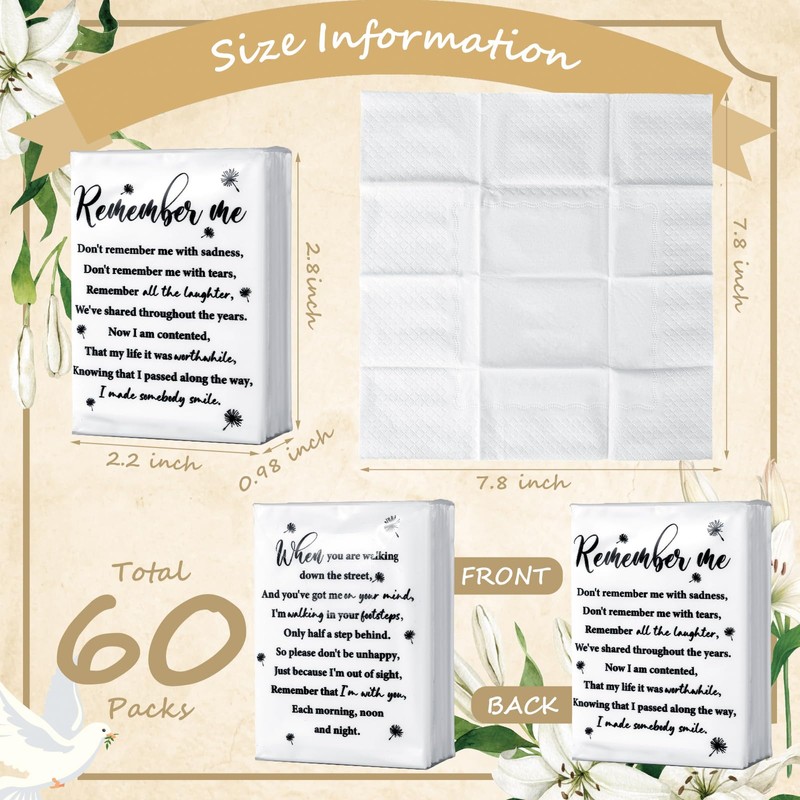 Sinmoe 60 Bulk Memorial Facial Tissues Inspirational Poem Funeral Pocket Tissues 3 Ply Mini Travel Size Tissue Packs Memorial Funeral Tissues for Funeral Guests Relatives Family Friends