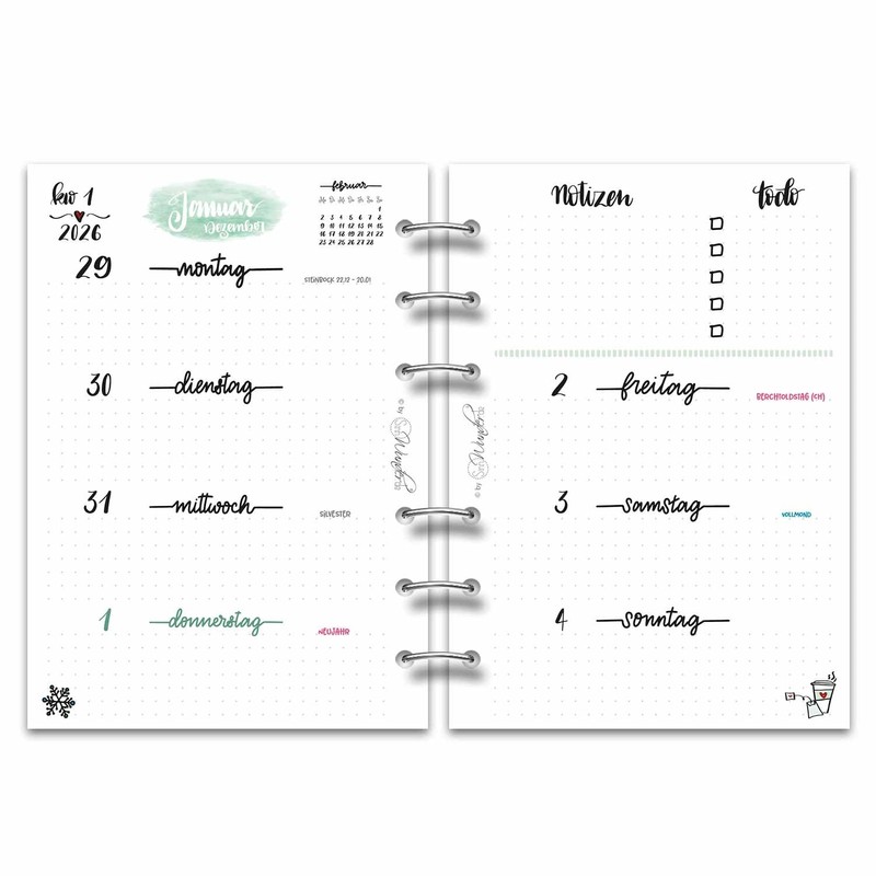 SinnWunder® Premium Weekly Calendar Inserts 2026-1 Week on 2 Pages - Size Genuine DIN A6 (10.5 x 14.8 cm) - Moterm Perforation - LetteringSinn