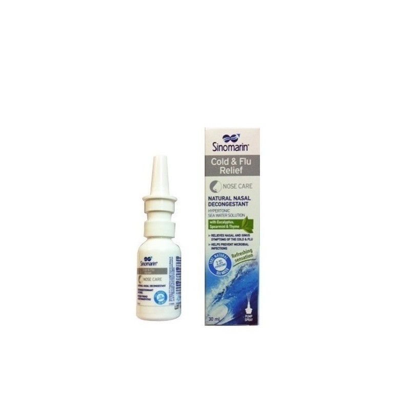The NEW Sinomarin ® Cold & Flu relief is a 100 % natural nasal decongestant , especially for the relief of nasal symptoms of flu and the common cold . Enriched with essential oils such as eucalyptus and peppermint extract and thyme