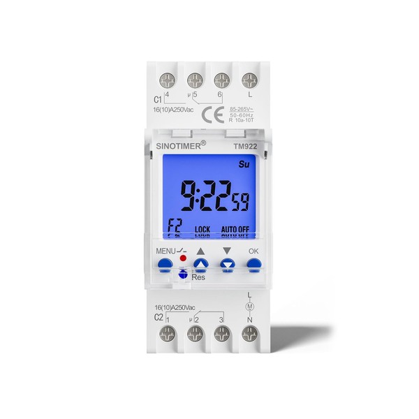 SINOTIMER Digital LCD Current Timer Switch, Dual Channel Digital Timer Switch Weekly Programmable Relay 200-250V Timeswitch DIN Rail Mount