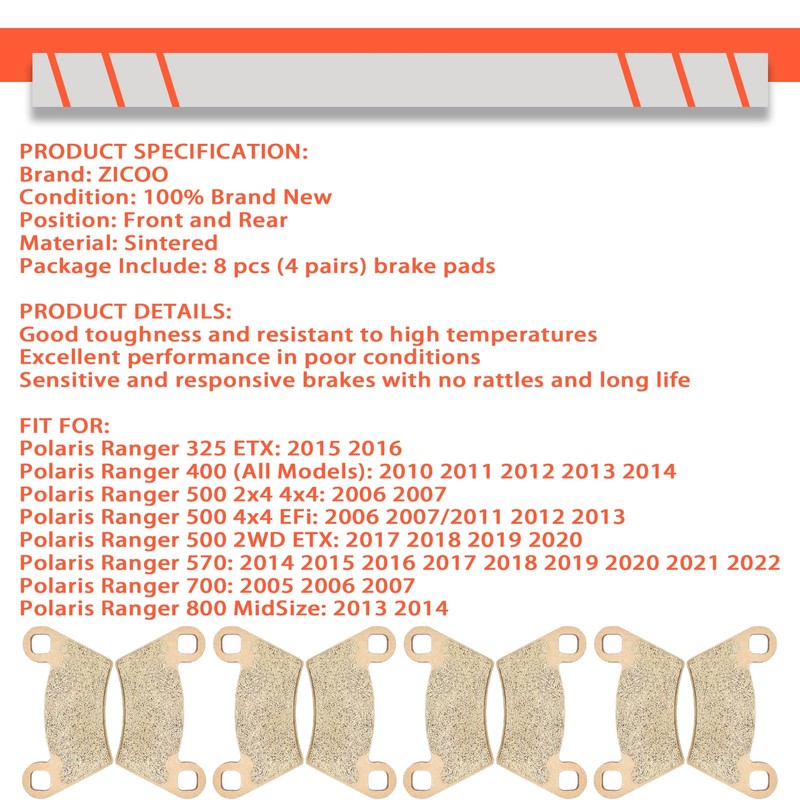 Sintered Front Rear Brake Pads for Polaris Ranger 800, Ranger 400 All Models, Ranger 500 2x4 4x4, Ranger 700 XP, Ranger 570 325, Ranger TM, Ranger EV, Ranger ETX