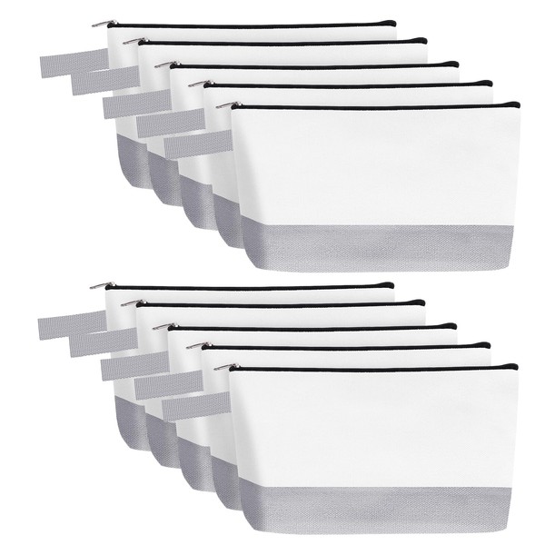Sinzip 10 Pieces Cotton Canvas Makeup Bag with Bottom and Strap, Multi-Purpose Cosmetic Bag with Zipper Travel Toiletry Pouch, Blank DIY Craft Bag (White&Grey, S)