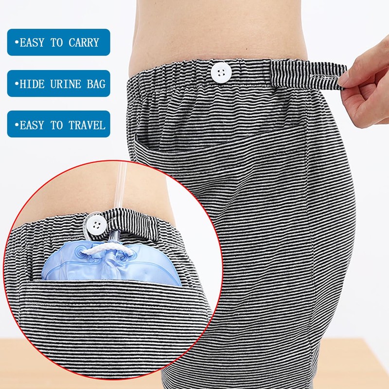 - 【Anti-slip Design】The waistband of the urine bag pants is designed with a urinary catheter fixing buckle, which fixes the buckle to prevent the urine bag from slipping, making it more convenient to use. There is an opening under the pocket of the urine bag pants to facilitate the urination valve to extend out of the pocket, which can be opened at will to discharge urine in the bag.