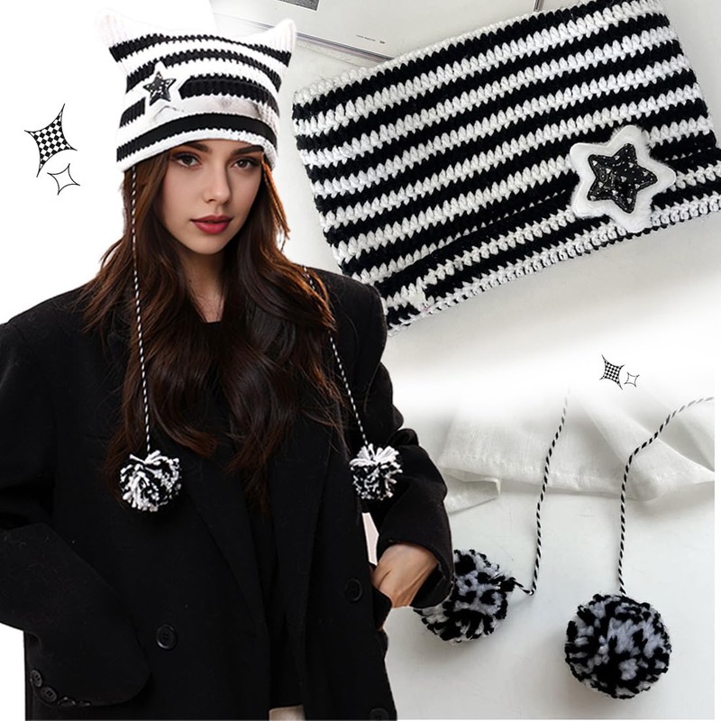 - Y2K Style: Our fashionable and cute Y2K cat ear beanie hat is a rectangle shape when laid flat, when you put it on your head will naturally form a pair of cute cat ears, full of art, suitable for various outfits.