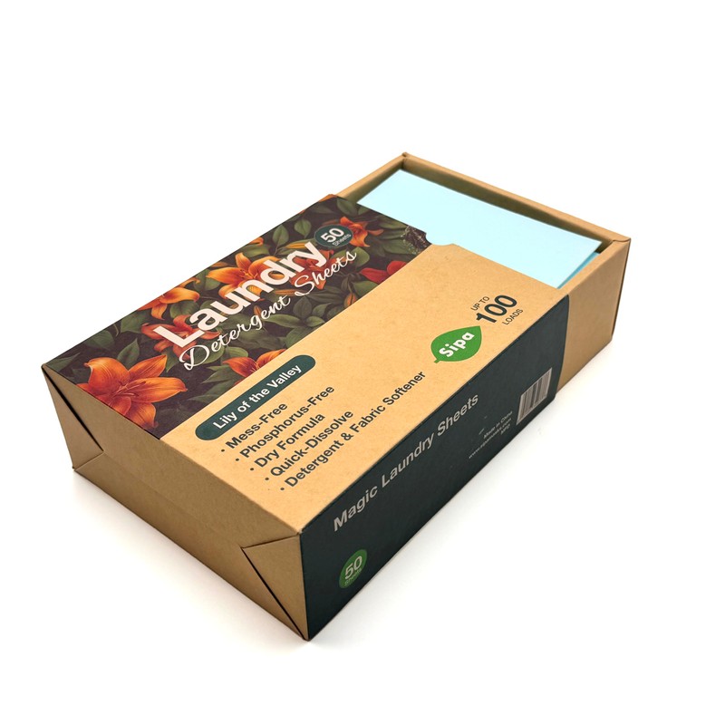 SIPA Laundry Detergent Sheets - Mess-free, eco-friendly, and quick-dissolve. Gentle on fabrics and skin, with a Lily of the Valley scent. Phosphorus-free and biodegradable. Suitable for all washing machines, these sheets act as both detergent and fabric softener.